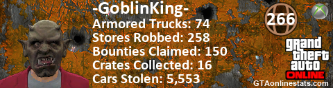 [URL=http://GTAonlinestats.com/showplayer/-GoblinKing-][IMG]http://GTAonlinestats.com/signature/-GoblinKing-/sig.png[/IMG][/URL]