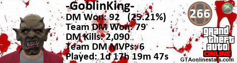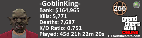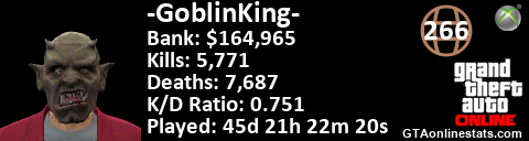 [URL=http://GTAonlinestats.com/showplayer/-GoblinKing-][IMG]http://GTAonlinestats.com/dmsignature/-GoblinKing-/sig.png[/IMG][/URL]