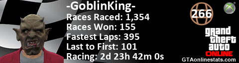 [URL=http://GTAonlinestats.com/showplayer/-GoblinKing-][IMG]http://GTAonlinestats.com/racesignature/-GoblinKing-/sig.png[/IMG][/URL]