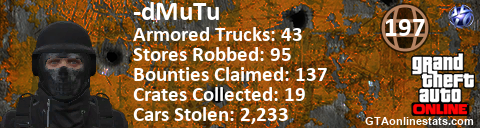 <a href="http://GTAonlinestats.com/showplayer/-dMuTu"><img src="http://GTAonlinestats.com/crimesignature/-dMuTu/sig.png" alt="-dMuTu" border="0" /></a>