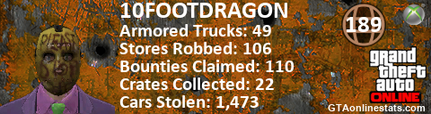 [URL=http://GTAonlinestats.com/showplayer/10FOOTDRAGON][IMG]http://GTAonlinestats.com/crimesignature/10FOOTDRAGON/sig.png[/IMG][/URL]