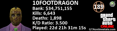 <a href="http://GTAonlinestats.com/showplayer/10FOOTDRAGON"><img src="http://GTAonlinestats.com/dmsignature/10FOOTDRAGON/sig.png" alt="10FOOTDRAGON" border="0" /></a>