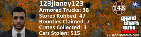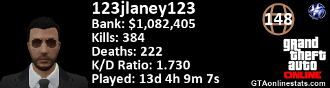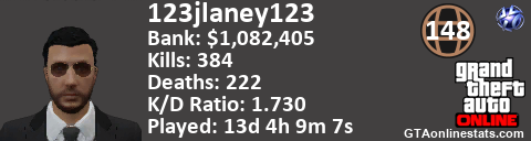 [URL=http://GTAonlinestats.com/showplayer/123jlaney123][IMG]http://GTAonlinestats.com/signature/123jlaney123/sig.png[/IMG][/URL]