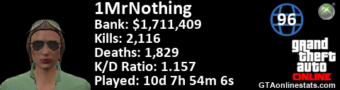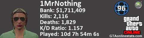<a href="http://GTAonlinestats.com/showplayer/1MrNothing"><img src="http://GTAonlinestats.com/signature/1MrNothing/sig.png" alt="1MrNothing" border="0" /></a>
