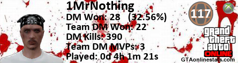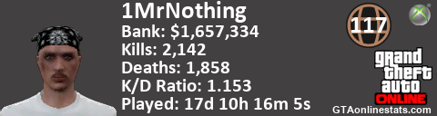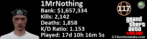 <a href="http://GTAonlinestats.com/showplayer/1MrNothing/2"><img src="http://GTAonlinestats.com/dmsignature/1MrNothing/2/sig.png" alt="1MrNothing" border="0" /></a>