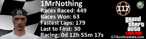 <a href="http://GTAonlinestats.com/showplayer/1MrNothing/2"><img src="http://GTAonlinestats.com/racesignature/1MrNothing/2/sig.png" alt="1MrNothing" border="0" /></a>