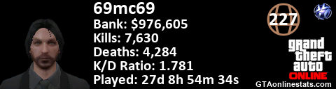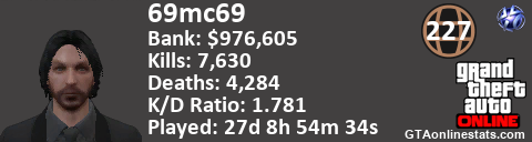 [URL=http://GTAonlinestats.com/showplayer/69mc69][IMG]http://GTAonlinestats.com/signature/69mc69/sig.png[/IMG][/URL]