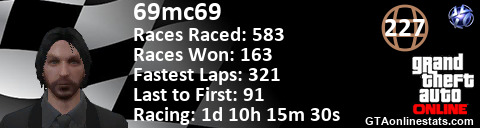<a href="http://GTAonlinestats.com/showplayer/69mc69"><img src="http://GTAonlinestats.com/racesignature/69mc69/sig.png" alt="69mc69" border="0" /></a>