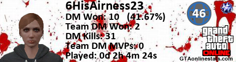 <a href="http://GTAonlinestats.com/showplayer/6HisAirness23"><img src="http://GTAonlinestats.com/dmsignature/6HisAirness23/sig.png" alt="6HisAirness23" border="0" /></a>