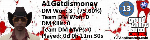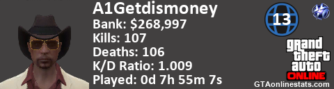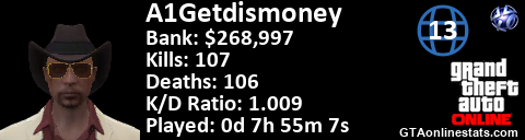 [URL=http://GTAonlinestats.com/showplayer/A1Getdismoney][IMG]http://GTAonlinestats.com/dmsignature/A1Getdismoney/sig.png[/IMG][/URL]