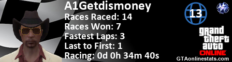 [URL=http://GTAonlinestats.com/showplayer/A1Getdismoney][IMG]http://GTAonlinestats.com/racesignature/A1Getdismoney/sig.png[/IMG][/URL]