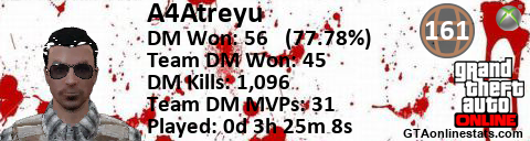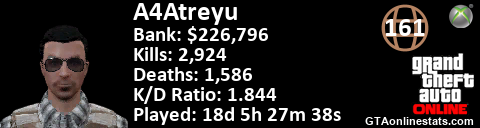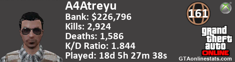 <a href="http://GTAonlinestats.com/showplayer/A4Atreyu"><img src="http://GTAonlinestats.com/signature/A4Atreyu/sig.png" alt="A4Atreyu" border="0" /></a>