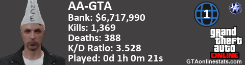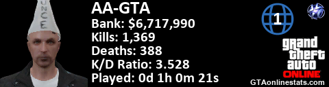 <a href="http://GTAonlinestats.com/showplayer/AA-GTA/2"><img src="http://GTAonlinestats.com/signature/AA-GTA/2/sig.png" alt="AA-GTA" border="0" /></a>