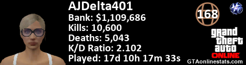 <a href="http://GTAonlinestats.com/showplayer/AJDelta401/2"><img src="http://GTAonlinestats.com/dmsignature/AJDelta401/2/sig.png" alt="AJDelta401" border="0" /></a>