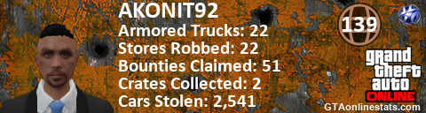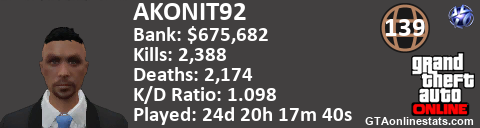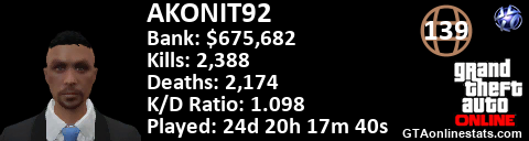 [URL=http://GTAonlinestats.com/showplayer/AKONIT92][IMG]http://GTAonlinestats.com/signature/AKONIT92/sig.png[/IMG][/URL]
