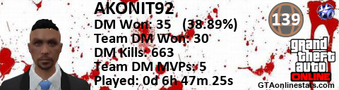 [URL=http://GTAonlinestats.com/showplayer/AKONIT92][IMG]http://GTAonlinestats.com/dmsignature/AKONIT92/sig.png[/IMG][/URL]