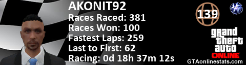 [URL=http://GTAonlinestats.com/showplayer/AKONIT92][IMG]http://GTAonlinestats.com/racesignature/AKONIT92/sig.png[/IMG][/URL]