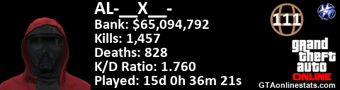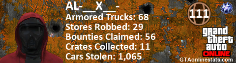 [URL=http://GTAonlinestats.com/showplayer/AL-__X__-][IMG]http://GTAonlinestats.com/crimesignature/AL-__X__-/sig.png[/IMG][/URL]