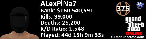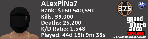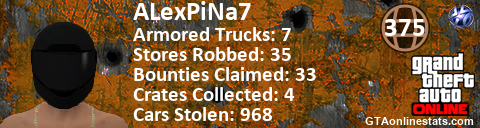 [URL=http://GTAonlinestats.com/showplayer/ALexPiNa7][IMG]http://GTAonlinestats.com/greysignature/ALexPiNa7/sig.png[/IMG][/URL]