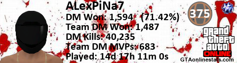 [URL=http://GTAonlinestats.com/showplayer/ALexPiNa7][IMG]http://GTAonlinestats.com/dmsignature/ALexPiNa7/sig.png[/IMG][/URL]