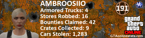 [URL=http://GTAonlinestats.com/showplayer/AMBROOSIIO][IMG]http://GTAonlinestats.com/greysignature/AMBROOSIIO/sig.png[/IMG][/URL]