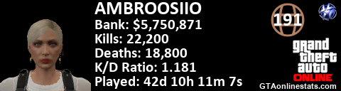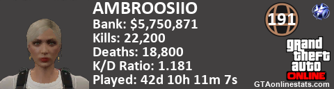 [URL=http://GTAonlinestats.com/showplayer/AMBROOSIIO][IMG]http://GTAonlinestats.com/signature/AMBROOSIIO/sig.png[/IMG][/URL]