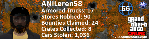 [URL=http://GTAonlinestats.com/showplayer/ANILeren58][IMG]http://GTAonlinestats.com/crimesignature/ANILeren58/sig.png[/IMG][/URL]