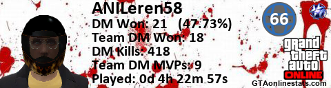 [URL=http://GTAonlinestats.com/showplayer/ANILeren58][IMG]http://GTAonlinestats.com/dmsignature/ANILeren58/sig.png[/IMG][/URL]