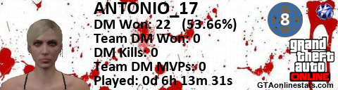 [URL=http://GTAonlinestats.com/showplayer/ANTONIO_17/2][IMG]http://GTAonlinestats.com/dmsignature/ANTONIO_17/2/sig.png[/IMG][/URL]