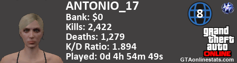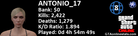 <a href="http://GTAonlinestats.com/showplayer/ANTONIO_17/2"><img src="http://GTAonlinestats.com/signature/ANTONIO_17/2/sig.png" alt="ANTONIO_17" border="0" /></a>