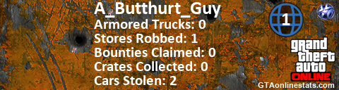 [URL=http://GTAonlinestats.com/showplayer/A_Butthurt_Guy/2][IMG]http://GTAonlinestats.com/crimesignature/A_Butthurt_Guy/2/sig.png[/IMG][/URL]
