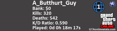 [URL=http://GTAonlinestats.com/showplayer/A_Butthurt_Guy/2][IMG]http://GTAonlinestats.com/signature/A_Butthurt_Guy/2/sig.png[/IMG][/URL]