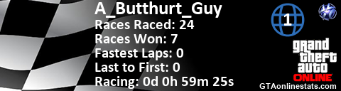 <a href="http://GTAonlinestats.com/showplayer/A_Butthurt_Guy/2"><img src="http://GTAonlinestats.com/racesignature/A_Butthurt_Guy/2/sig.png" alt="A_Butthurt_Guy" border="0" /></a>
