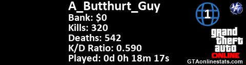 <a href="http://GTAonlinestats.com/showplayer/A_Butthurt_Guy/2"><img src="http://GTAonlinestats.com/signature/A_Butthurt_Guy/2/sig.png" alt="A_Butthurt_Guy" border="0" /></a>