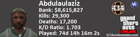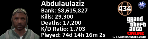 <a href="http://GTAonlinestats.com/showplayer/Abdulaulaziz"><img src="http://GTAonlinestats.com/dmsignature/Abdulaulaziz/sig.png" alt="Abdulaulaziz" border="0" /></a>