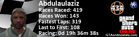 [URL=http://GTAonlinestats.com/showplayer/Abdulaulaziz][IMG]http://GTAonlinestats.com/racesignature/Abdulaulaziz/sig.png[/IMG][/URL]