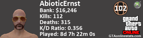 <a href="http://GTAonlinestats.com/showplayer/AbioticErnst"><img src="http://GTAonlinestats.com/signature/AbioticErnst/sig.png" alt="AbioticErnst" border="0" /></a>