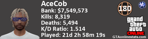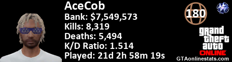 <a href="http://GTAonlinestats.com/showplayer/AceCob"><img src="http://GTAonlinestats.com/signature/AceCob/sig.png" alt="AceCob" border="0" /></a>