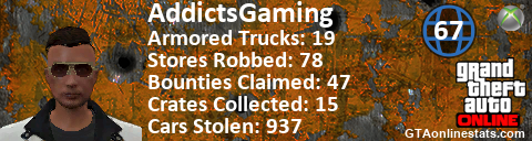 [URL=http://GTAonlinestats.com/showplayer/AddictsGaming][IMG]http://GTAonlinestats.com/signature/AddictsGaming/sig.png[/IMG][/URL]