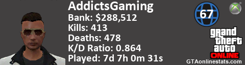 <a href="http://GTAonlinestats.com/showplayer/AddictsGaming"><img src="http://GTAonlinestats.com/greysignature/AddictsGaming/sig.png" alt="AddictsGaming" border="0" /></a>