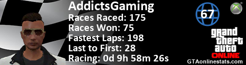 [URL=http://GTAonlinestats.com/showplayer/AddictsGaming][IMG]http://GTAonlinestats.com/racesignature/AddictsGaming/sig.png[/IMG][/URL]