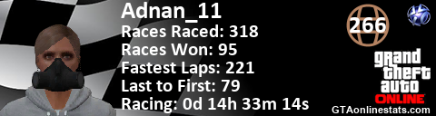 [URL=http://GTAonlinestats.com/showplayer/Adnan_11][IMG]http://GTAonlinestats.com/racesignature/Adnan_11/sig.png[/IMG][/URL]