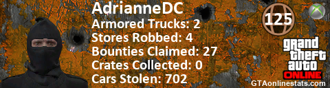 [URL=http://GTAonlinestats.com/showplayer/AdrianneDC][IMG]http://GTAonlinestats.com/crimesignature/AdrianneDC/sig.png[/IMG][/URL]