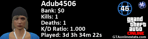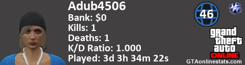 <a href="http://GTAonlinestats.com/showplayer/Adub4506"><img src="http://GTAonlinestats.com/dmsignature/Adub4506/sig.png" alt="Adub4506" border="0" /></a>