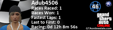 <a href="http://GTAonlinestats.com/showplayer/Adub4506"><img src="http://GTAonlinestats.com/racesignature/Adub4506/sig.png" alt="Adub4506" border="0" /></a>