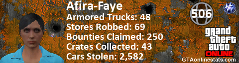 [URL=http://GTAonlinestats.com/showplayer/Afira-Faye][IMG]http://GTAonlinestats.com/randomsignature/Afira-Faye/sig.png[/IMG][/URL]