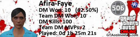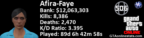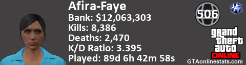 [URL=http://GTAonlinestats.com/showplayer/Afira-Faye][IMG]http://GTAonlinestats.com/dmsignature/Afira-Faye/sig.png[/IMG][/URL]