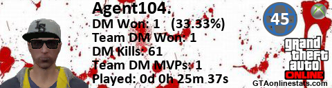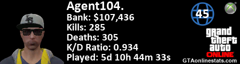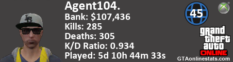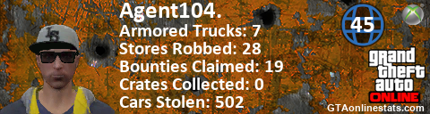 <a href="http://GTAonlinestats.com/showplayer/Agent104."><img src="http://GTAonlinestats.com/signature/Agent104./sig.png" alt="Agent104." border="0" /></a>