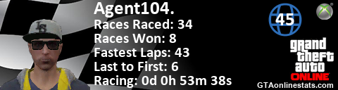 <a href="http://GTAonlinestats.com/showplayer/Agent104."><img src="http://GTAonlinestats.com/racesignature/Agent104./sig.png" alt="Agent104." border="0" /></a>