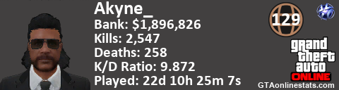[URL=http://GTAonlinestats.com/showplayer/Akyne_][IMG]http://GTAonlinestats.com/signature/Akyne_/sig.png[/IMG][/URL]